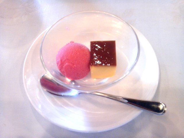 ラズベリーのシャーベットとスペイン風のプリンだそうです。